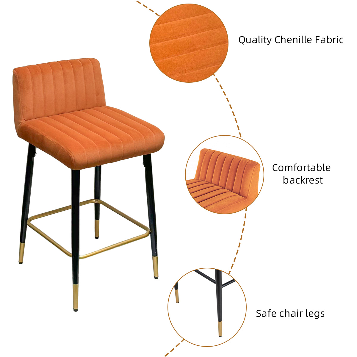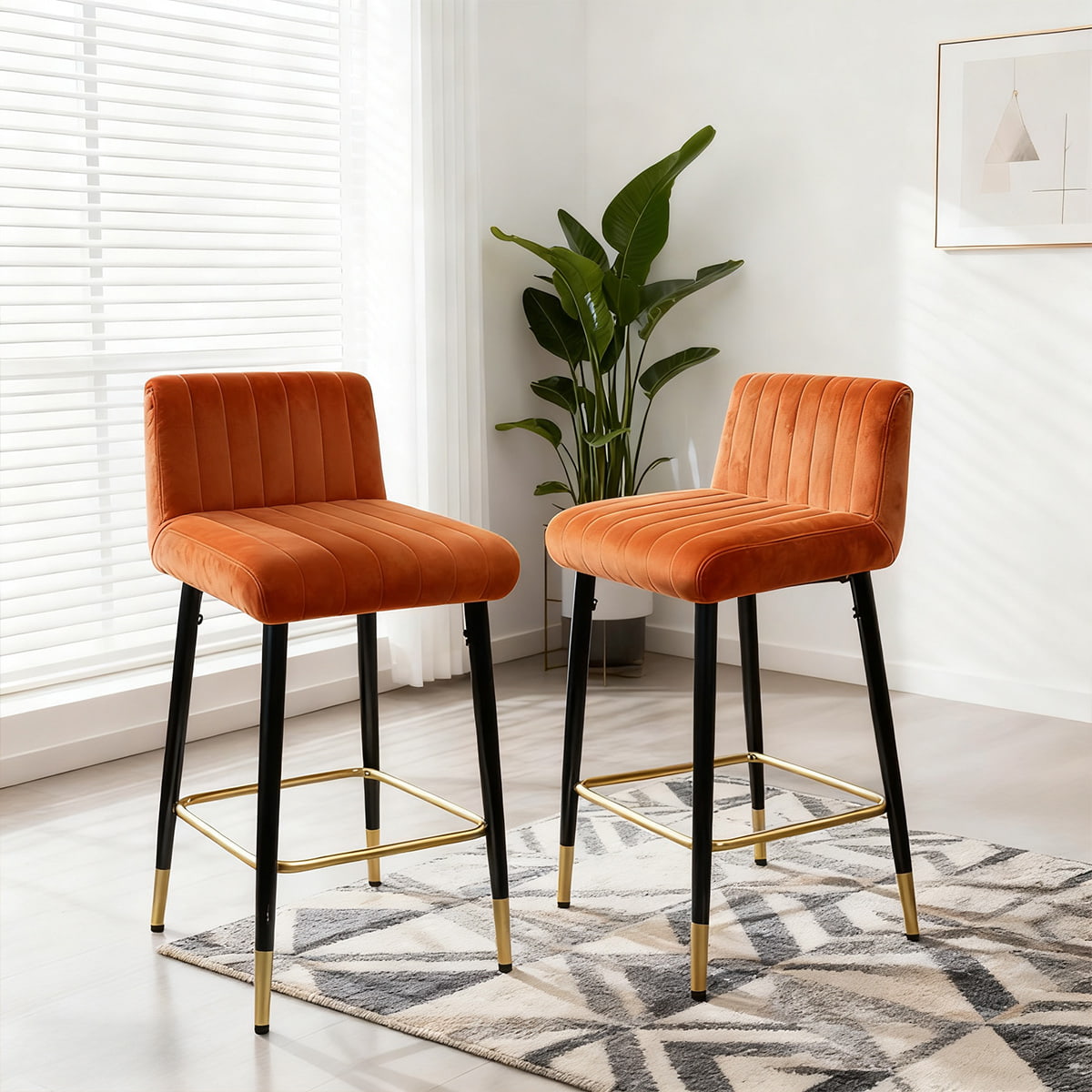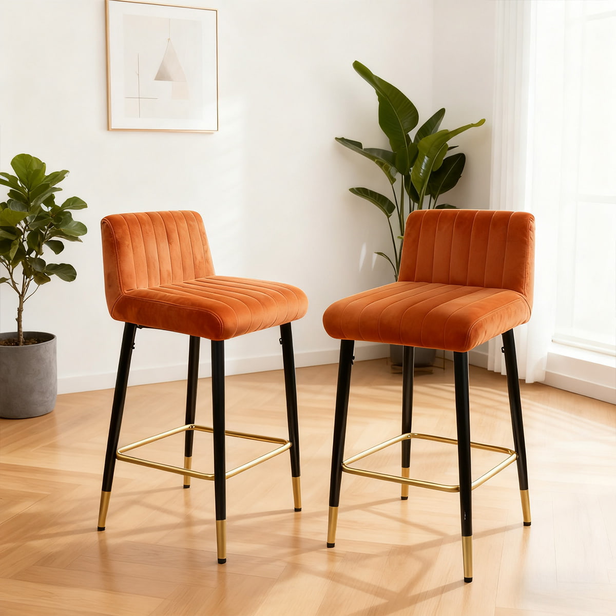 আধুনিক ওচার অরেঞ্জ ভেলভেট বার স্টুল — 360° সুইভেল কাউন্টার হাইট চেয়ার যার সাথে কালো ও সোনার ধাতব পা, নরম গৃহসজ্জার আসন এবং রান্নাঘর দ্বীপ, বার বা খাবার ঘরের জন্য ফুটরেস্ট