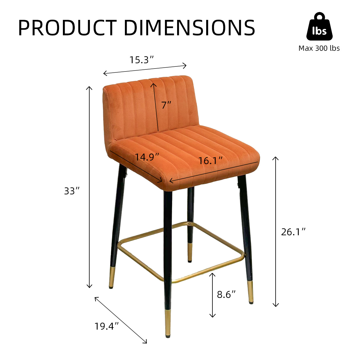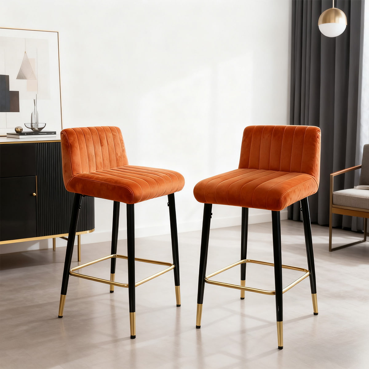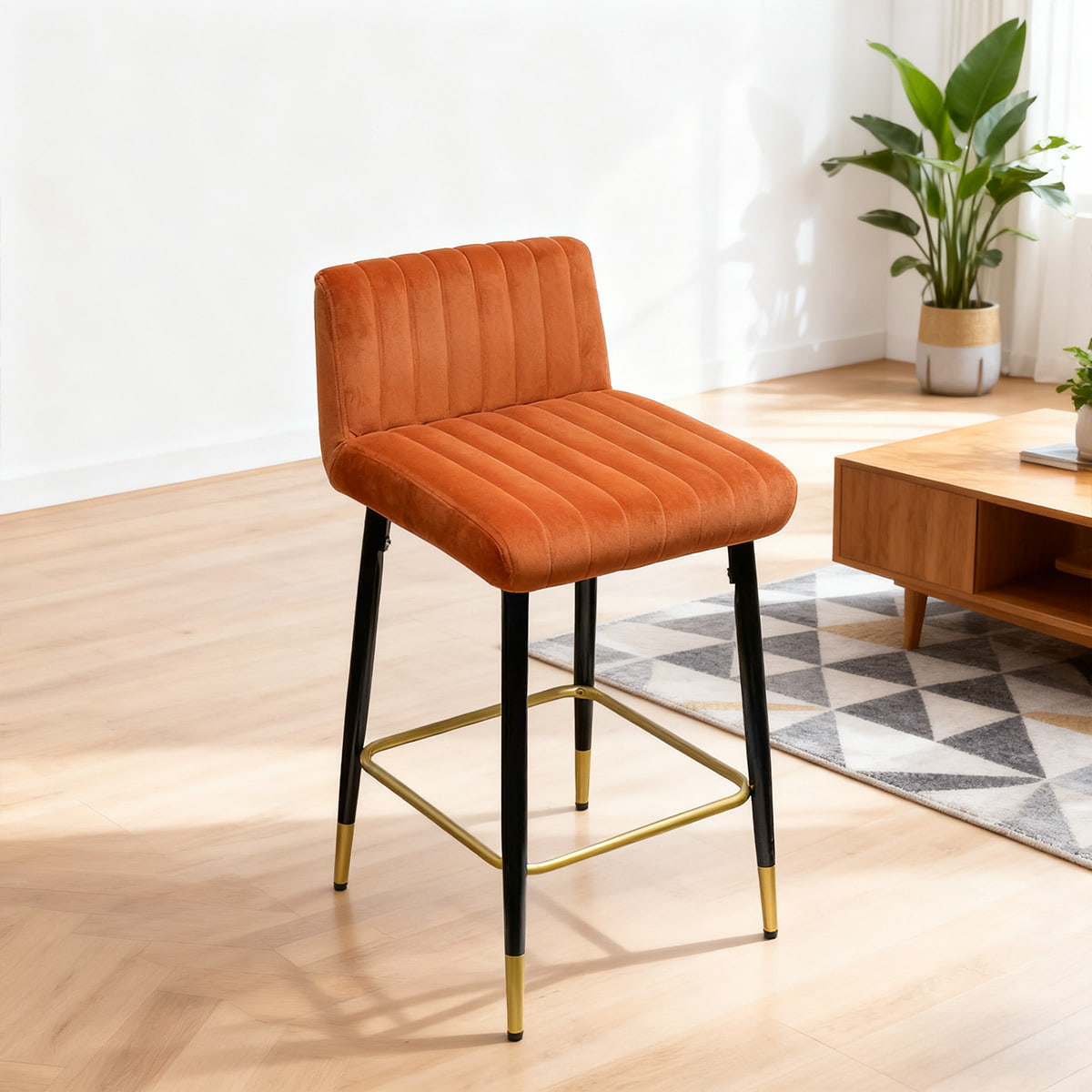 আধুনিক ওচার অরেঞ্জ ভেলভেট বার স্টুল — 360° সুইভেল কাউন্টার হাইট চেয়ার যার সাথে কালো ও সোনার ধাতব পা, নরম গৃহসজ্জার আসন এবং রান্নাঘর দ্বীপ, বার বা খাবার ঘরের জন্য ফুটরেস্ট