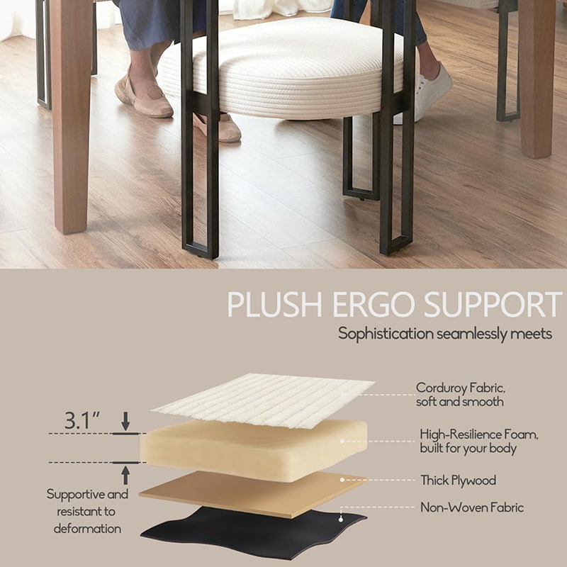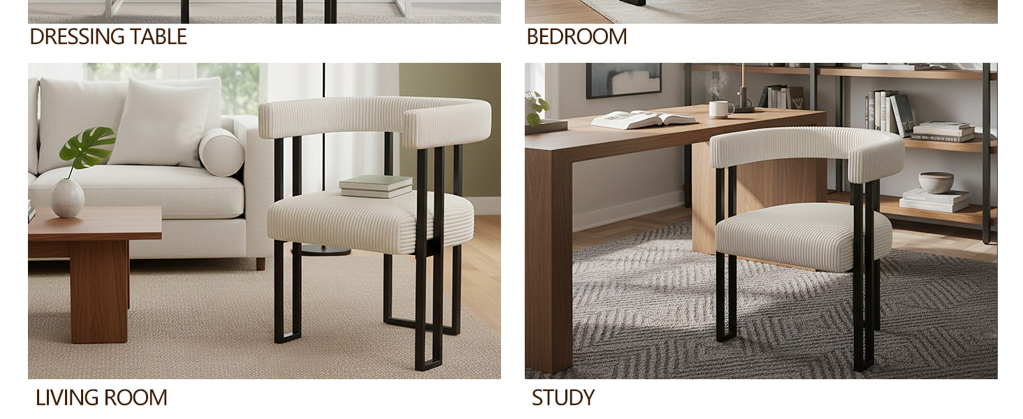 আসনটি উচ্চ-স্থিতিস্থাপক ফোমে ভরা যা সময়ের সাথে সাথে এর আকৃতি বজায় রাখে, ডাইনিং টেবিল, ড্রেসিং টেবিল বা হোম অফিস ডেস্কে ব্যবহার করা হোক না কেন নির্ভরযোগ্য সহায়তা প্রদান করে। একটি সুচিন্তিতভাবে ডিজাইন করা U-আকৃতির ব্যাকরেস্ট কোমর এবং পিঠের জন্য ergonomic সমর্থন প্রদান করে, বর্ধিত বসার সময় ক্লান্তি কমাতে সাহায্য করে।