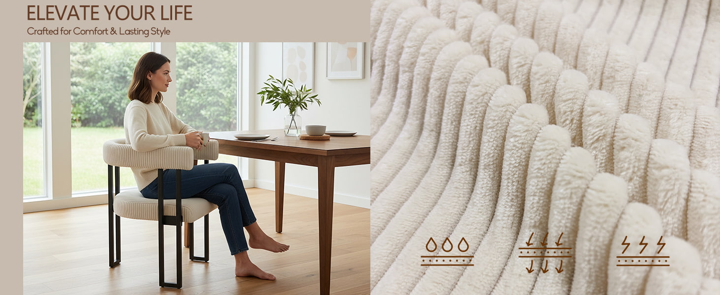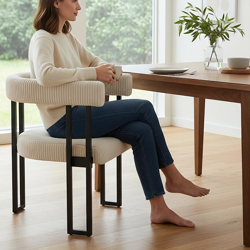 আরও জানুনএই বাউকল ডাইনিং চেয়ারটি প্রতিদিনের আরামের সাথে আধুনিক সরলতাকে একত্রিত করে, এটি সমসাময়িক বাড়ির জন্য একটি বহুমুখী বসার সমাধান করে তোলে। নরম কর্ডুরয় ফ্যাব্রিকের গৃহসজ্জায় সজ্জিত, চেয়ারটি একটি আরামদায়ক, ত্বক-বান্ধব স্পর্শ সরবরাহ করে এবং প্রতিদিনের ডাইনিং ব্যবহারের জন্য যথেষ্ট টেকসই থাকে।