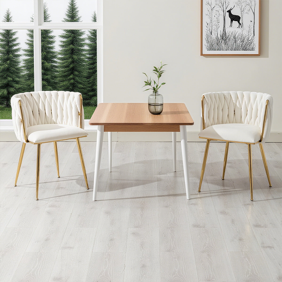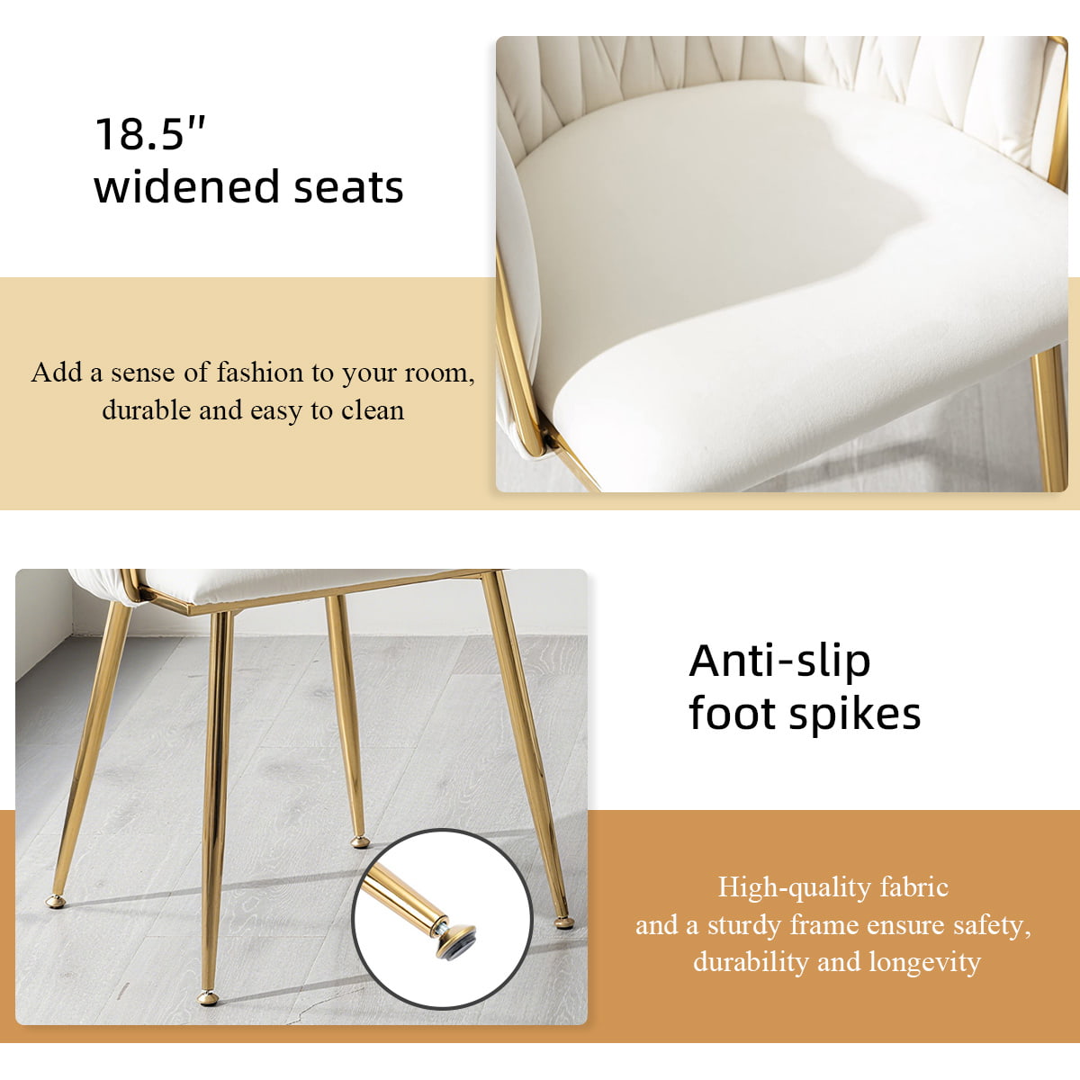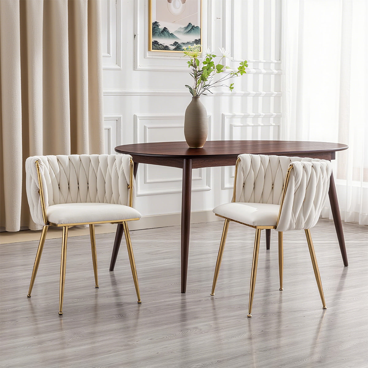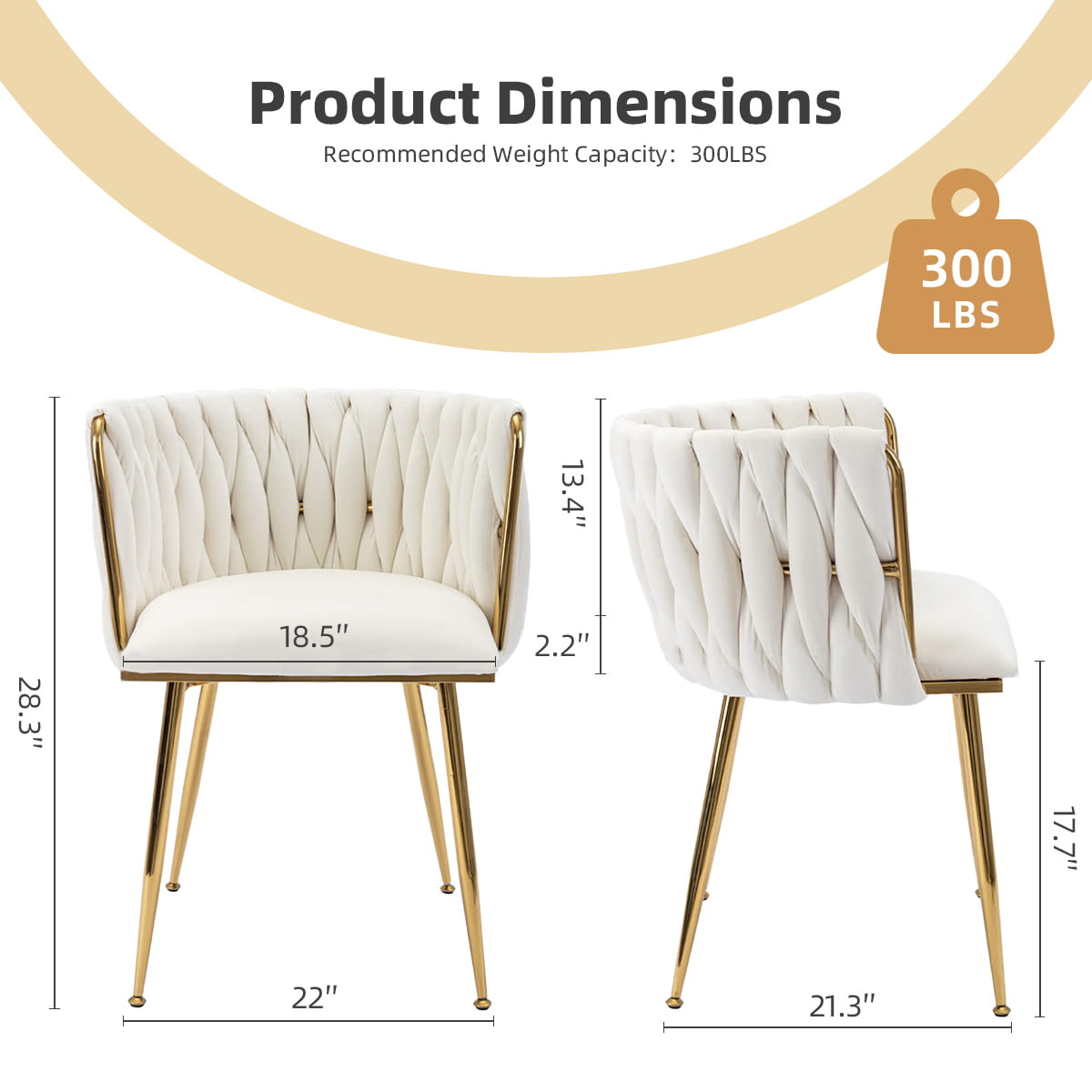 আইভরি ভেলভেট আপহোলস্টার্ড ডাইনিং চেয়ার - গোল্ডেন মেটাল পা সহ আধুনিক বোনা ব্যাক অ্যাকসেন্ট চেয়ার, ডাইনিং রুমের জন্য মিড-সেঞ্চুরি সাইড চেয়ার, লিভিং রুম, রান্নাঘর বা ভ্যানিটি