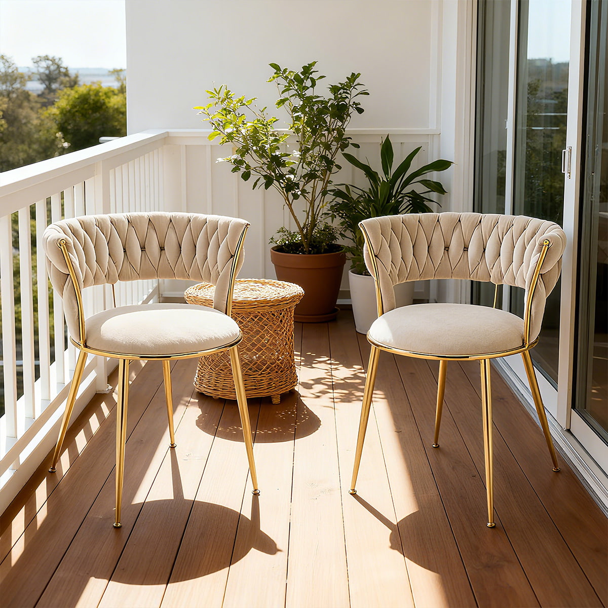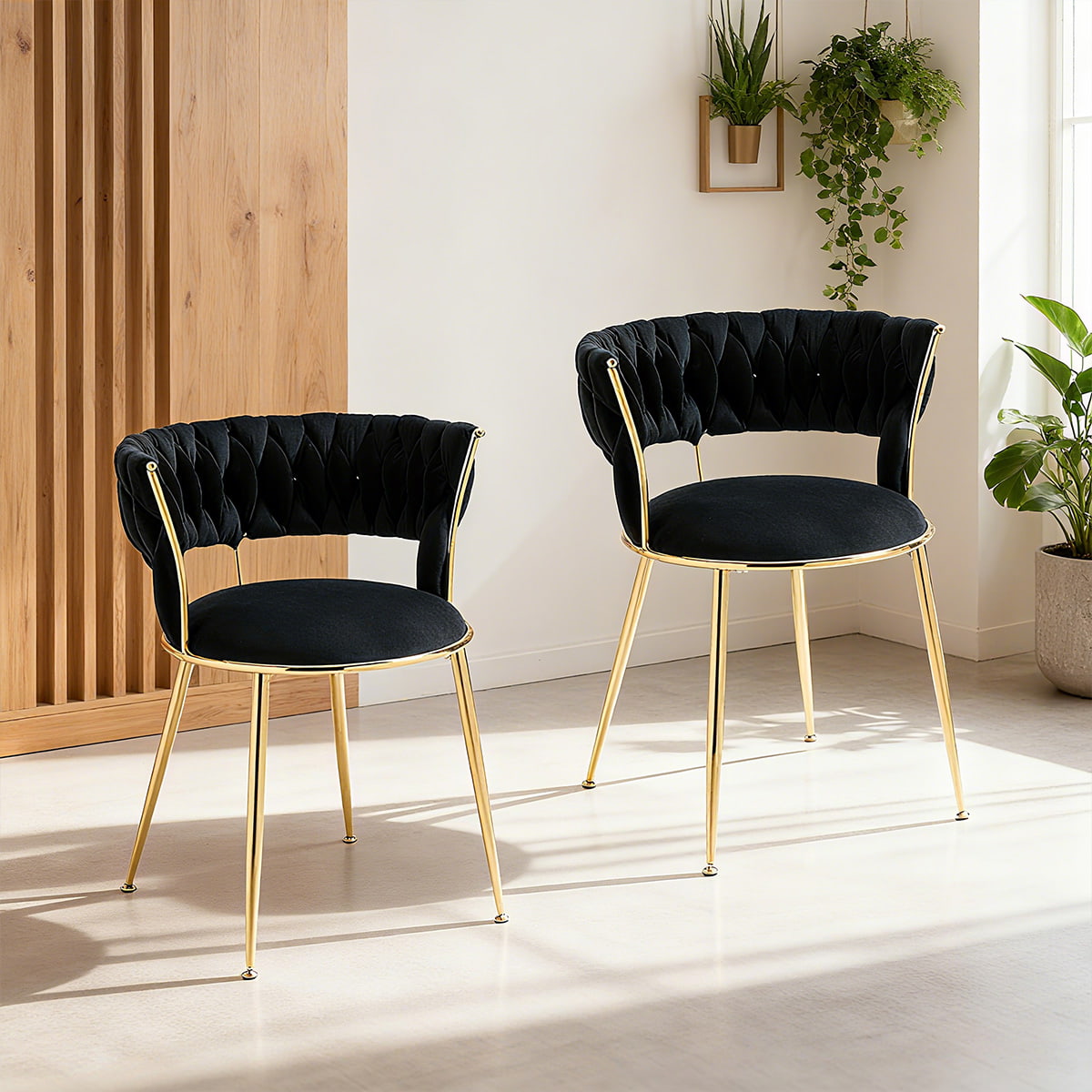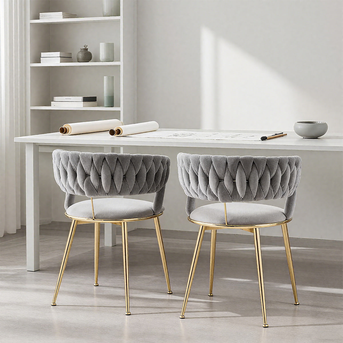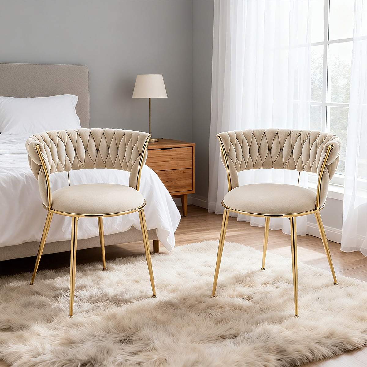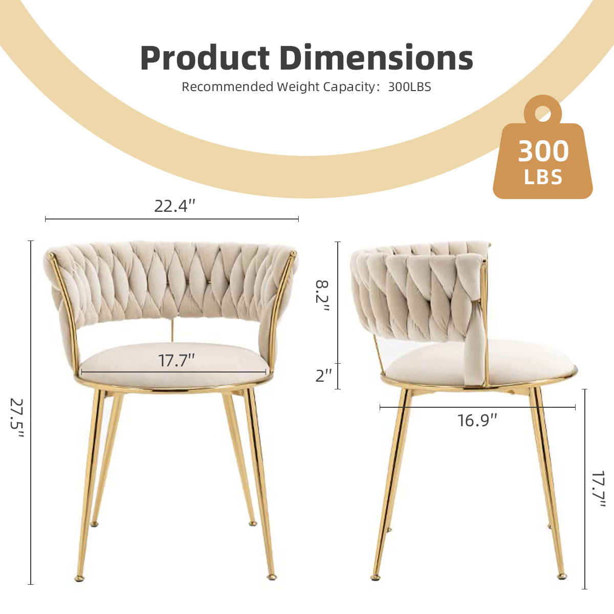 বোনা ব্যাকরেস্ট এবং গোল্ড মেটাল লেগ সহ আধুনিক আইভরি ভেলভেট ডাইনিং চেয়ার - ডাইনিং রুম, রান্নাঘর বা থাকার জায়গার জন্য মার্জিত আপহোলস্টার্ড অ্যাকসেন্ট চেয়ার