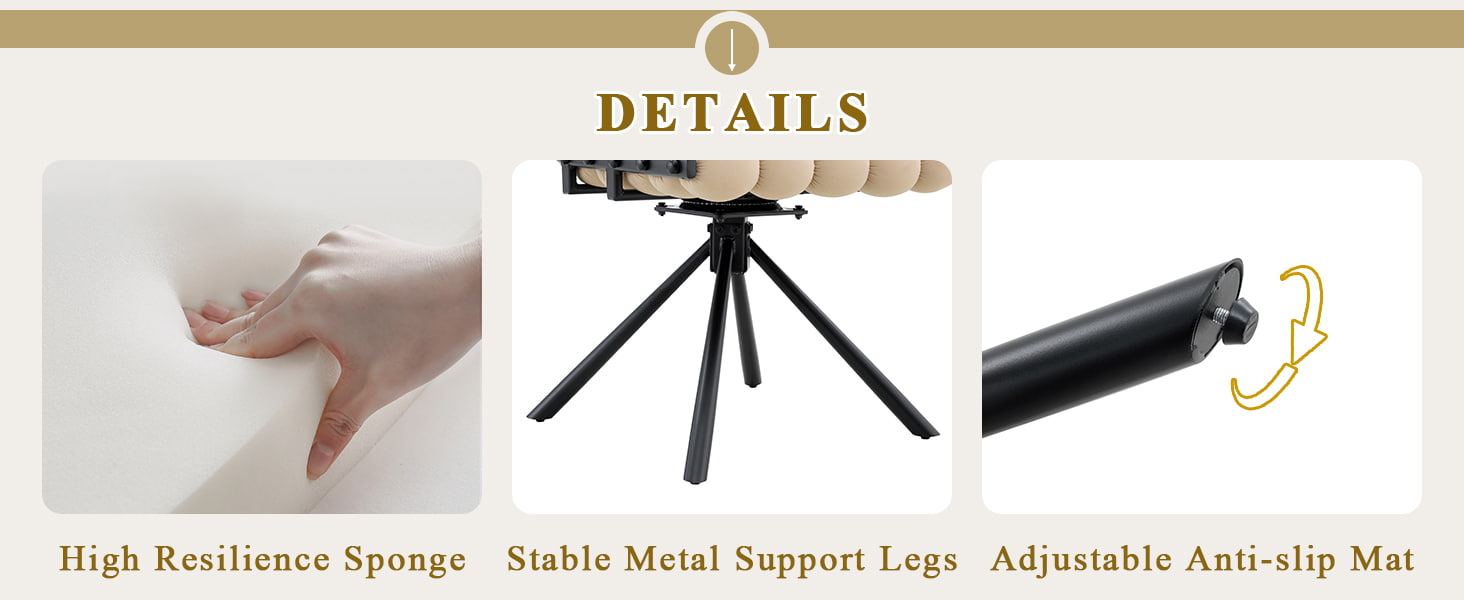 এই মখমল সুইভেল ডাইনিং চেয়ারটি আধুনিক ডাইনিং স্পেস, লাইফস্টাইল ইন্টেরিয়র এবং বুটিক বাণিজ্যিক পরিবেশের জন্য ডিজাইন করা হয়েছে। একটি ভাস্কর্য বুদ্বুদ কুশন ব্যাকরেস্ট এবং মসৃণ ডাচ মখমলের গৃহসজ্জার সামগ্রী সহ, চেয়ারটি প্রতিদিনের আরামের সাথে নজরকাড়া নকশাকে একত্রিত করে। 360-ডিগ্রি সুইভেল ফাংশন নমনীয় চলাচলের অনুমতি দেয়, যখন শক্ত ধাতব পা এবং নো-হুইল বেস ডাইনিং রুম, লিভিং রুম, মেকআপ এলাকা এবং ক্যাফে বসার জন্য নির্ভরযোগ্য স্থিতিশীলতা প্রদান করে। এর অর্গনোমিক বাঁকানো পিঠ এবং উচ্চ-স্থিতিস্থাপক স্পঞ্জ কুশনিং শরীরের চাপ সমানভাবে বিতরণ করতে সাহায্য করে, বর্ধিত বসার সময় আরামদায়ক সহায়তা প্রদান করে।