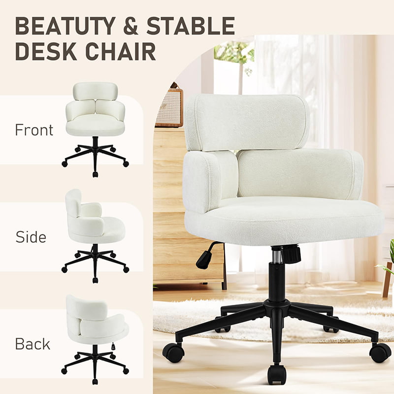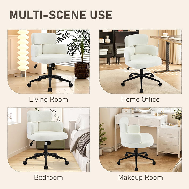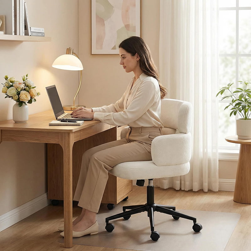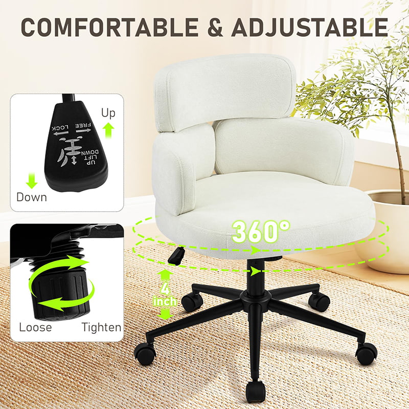 এই গৃহসজ্জার সুইভেল অফিস চেয়ারটি আধুনিক হোম অফিস, বুটিক ওয়ার্কস্পেস এবং জীবনধারা-কেন্দ্রিক অভ্যন্তরগুলির জন্য ডিজাইন করা হয়েছে। সমন্বিত বাহু সমর্থন সহ একটি স্বতন্ত্র ক্লোভার-আকৃতির ব্যাকরেস্ট সমন্বিত, এই চেয়ারটি কার্যকরী এর্গোনমিক্সের সাথে চাক্ষুষ আবেদনকে একত্রিত করে। চওড়া, নরমভাবে প্যাডেড সিটটি ত্বক-বান্ধব চেনিল ফ্যাব্রিকে গৃহসজ্জার সামগ্রী, যা দীর্ঘ সময় কাজ, পড়া বা বিশ্রামের জন্য একটি প্লাশ এবং আরামদায়ক বসার অভিজ্ঞতা প্রদান করে। একটি সামঞ্জস্যযোগ্য উচ্চতা প্রক্রিয়া, মসৃণ 360-ডিগ্রি সুইভেল এবং মৃদু রকিং ফাংশন ব্যবহারকারীদের তাদের বসার অবস্থান সহজে কাস্টমাইজ করতে দেয়, যখন বলিষ্ঠ ধাতব বেস এবং নীরব রোলিং কাস্টারগুলি বিভিন্ন পরিবেশে স্থিতিশীলতা, গতিশীলতা এবং মেঝে সুরক্ষা নিশ্চিত করে।