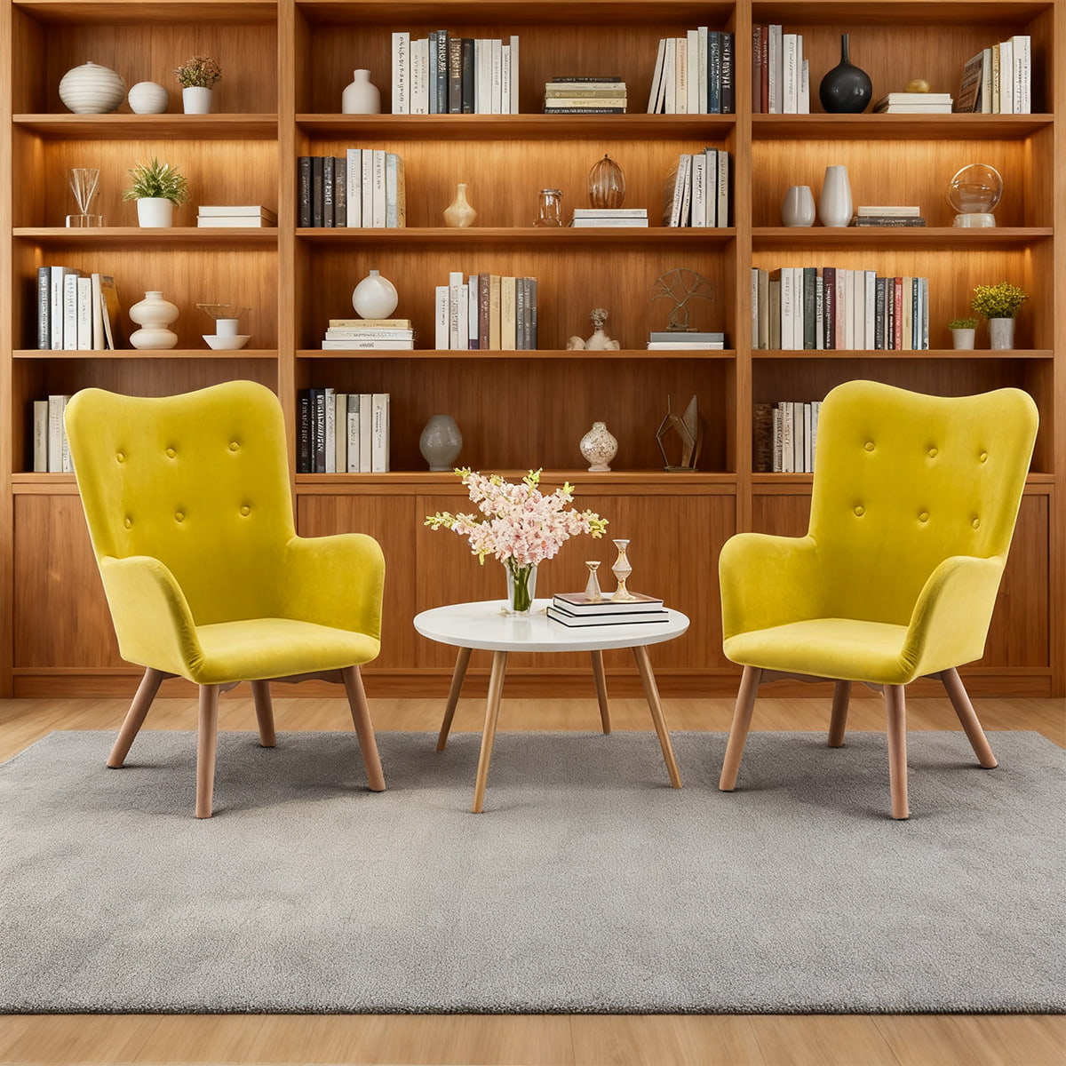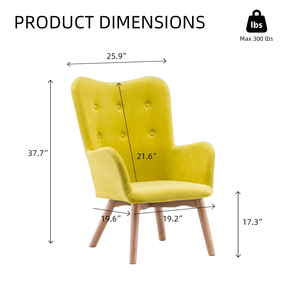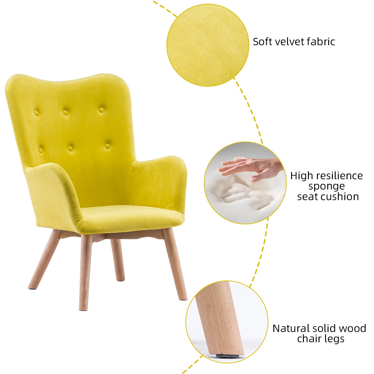 আধুনিক হলুদ ভেলভেট অ্যাকসেন্ট আর্মচেয়ার — লিভিং রুম, বেডরুম বা অফিসের জন্য কাঠের পা এবং আর্মরেস্ট সহ উইংব্যাক টাফ্টেড অবসর চেয়ার