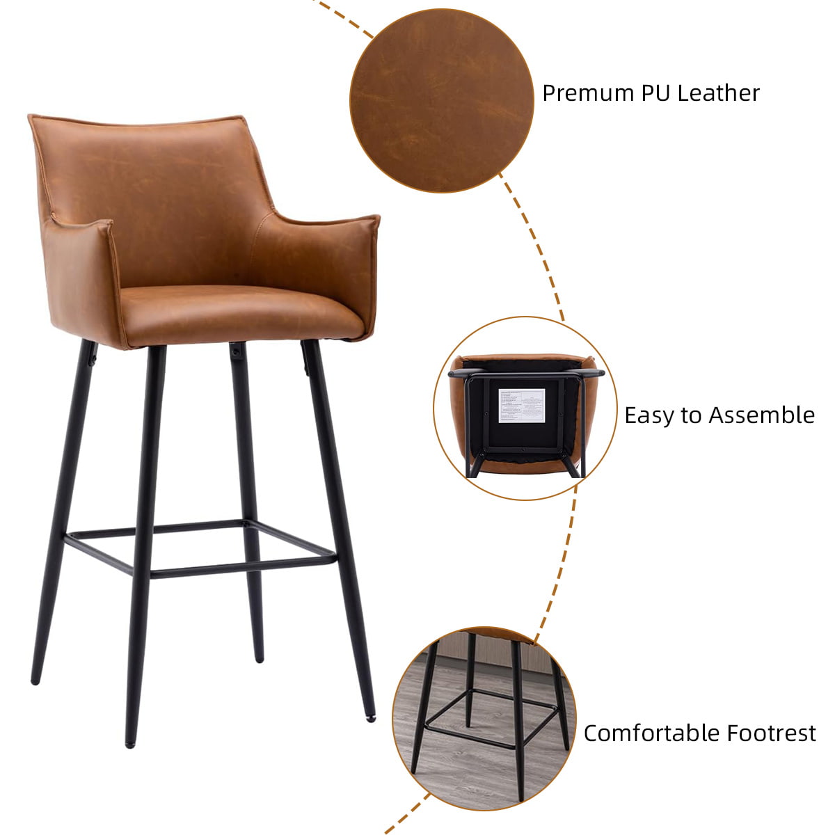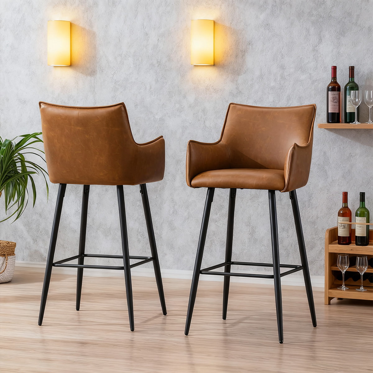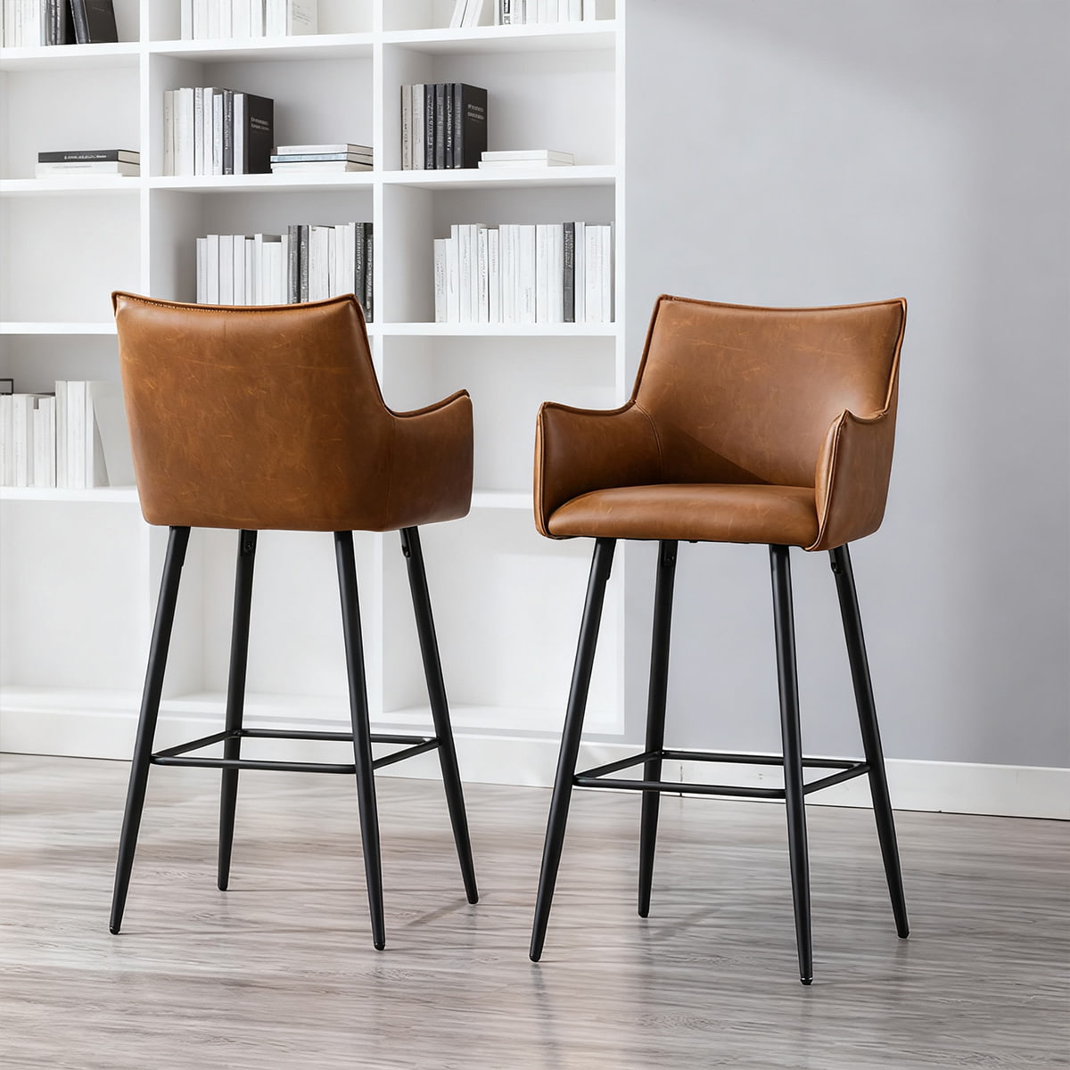 আর্মরেস্ট এবং ব্যাকরেস্ট সহ আধুনিক ব্রাউন পিইউ লেদার বার স্টুল — কিচেন আইল্যান্ড, বিস্ট্রো বা হোম বারের জন্য কালো ধাতব পা সহ কাউন্টার হাইট আপহোলস্টার্ড বার চেয়ার