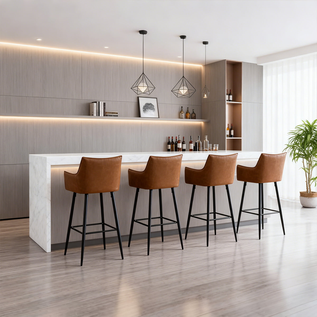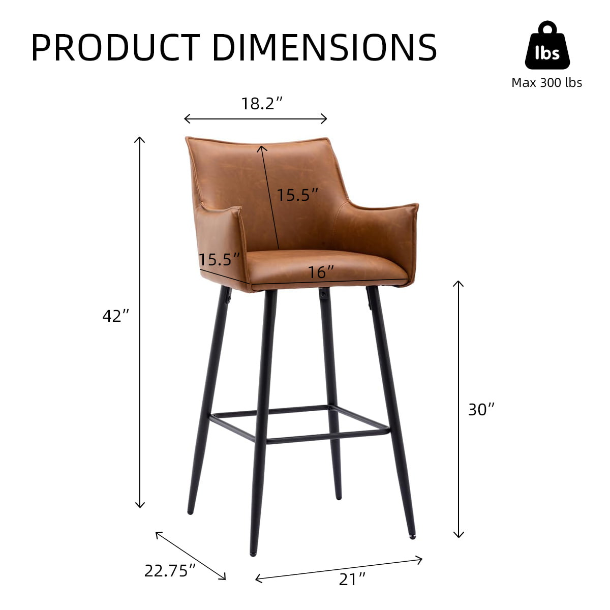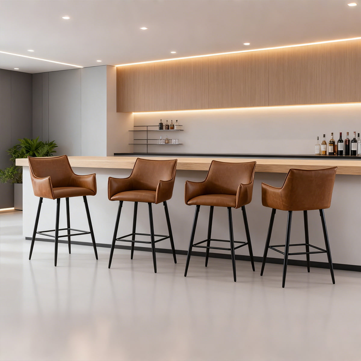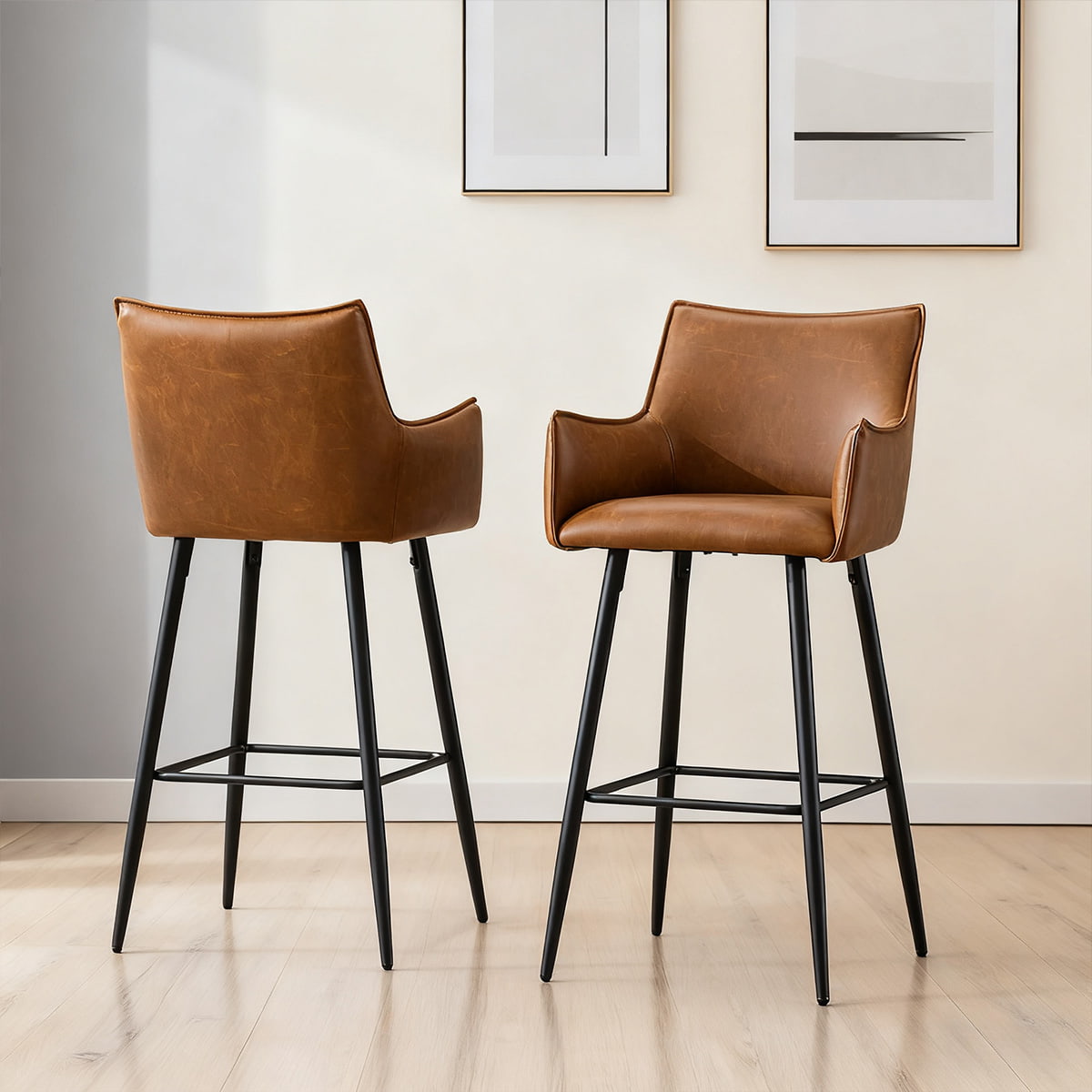 আর্মরেস্ট এবং ব্যাকরেস্ট সহ আধুনিক ব্রাউন পিইউ লেদার বার স্টুল — কিচেন আইল্যান্ড, বিস্ট্রো বা হোম বারের জন্য কালো ধাতব পা সহ কাউন্টার হাইট আপহোলস্টার্ড বার চেয়ার
